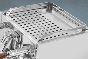 Structure en acier inoxydable, pieds en aluminium poli, grand chauffe-tasses et bac d'égouttage pratique.