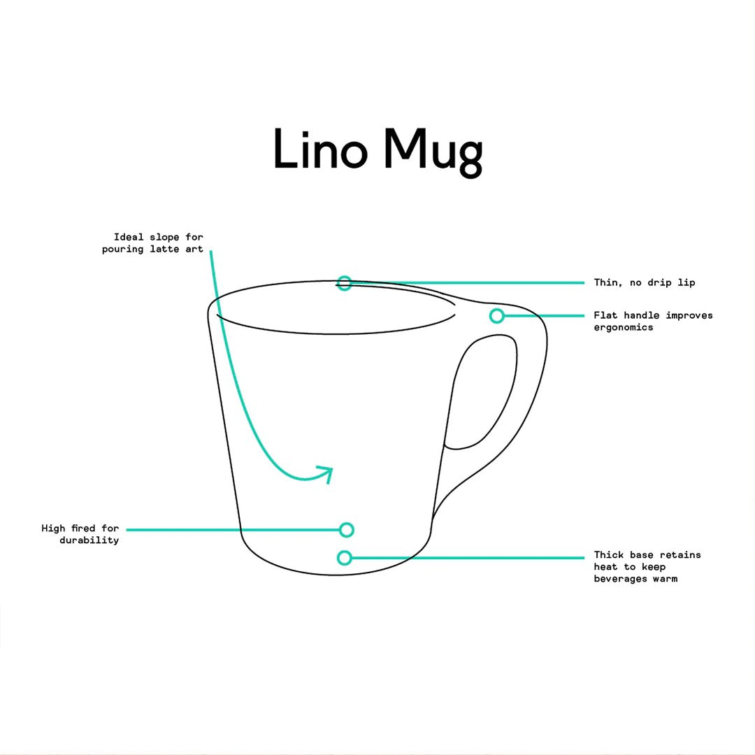 - Versions disponibles dans la série Lino : Tasse à espresso 9 cl, tasse à cappuccino 18 cl, tasses latte 24 cl et 36 cl, tasse à café 30 cl, assiettes pulled, pot à lait et mugs colorés