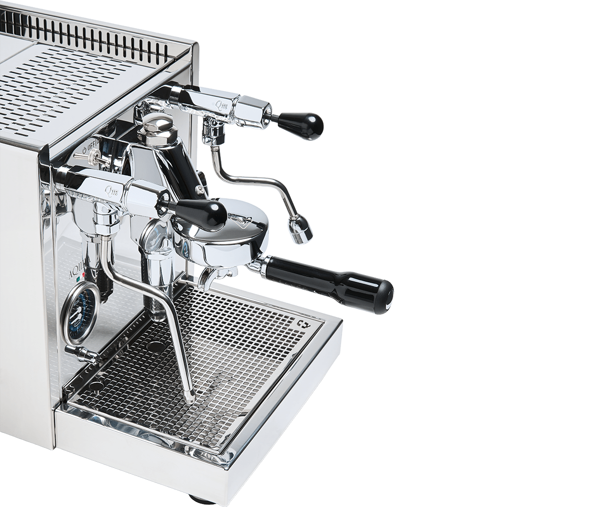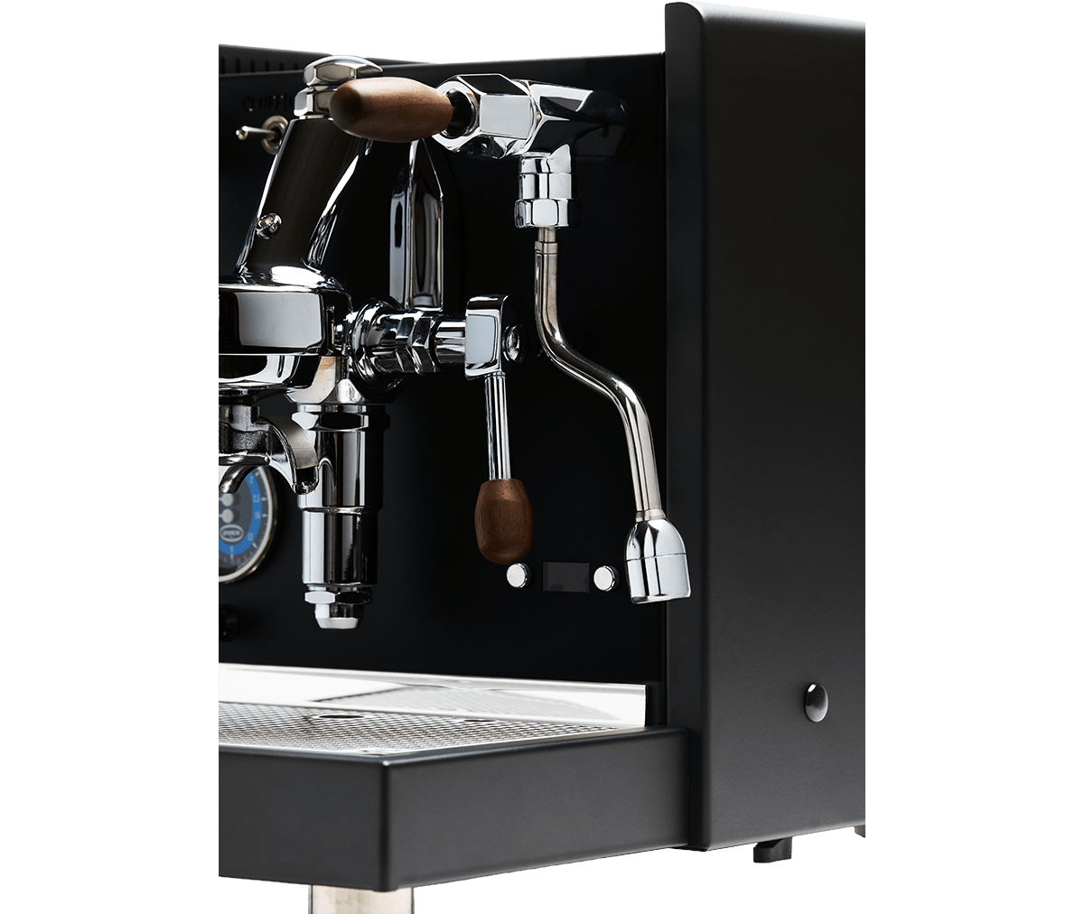 Matériaux : Acier inoxydable complet ; disponible en acier, noir mat et blanc ; porte-filtre en bois et joysticks ; groupe de café Quick Mill Aquila avec mushroom en acier inoxydable