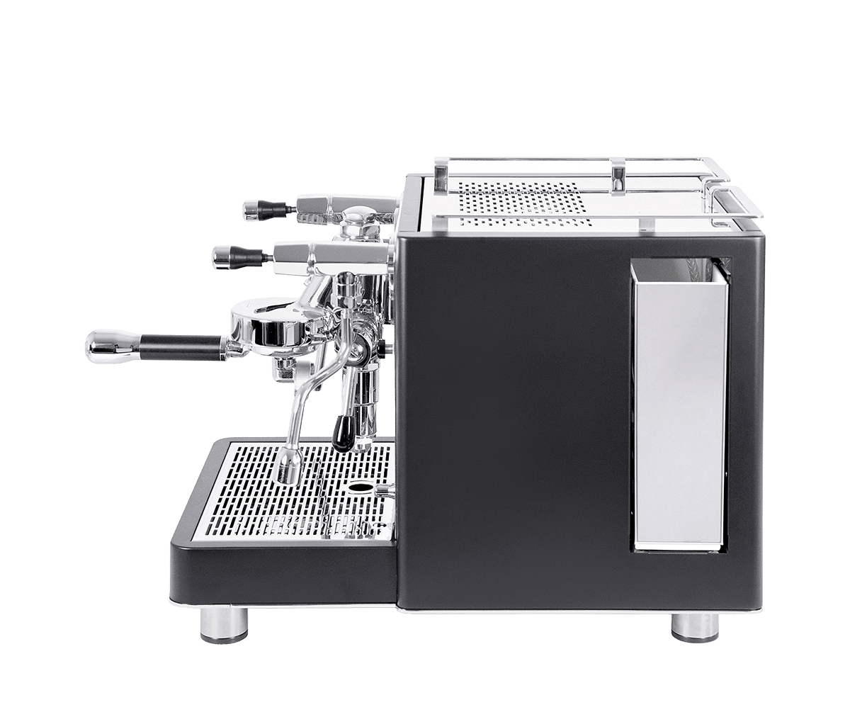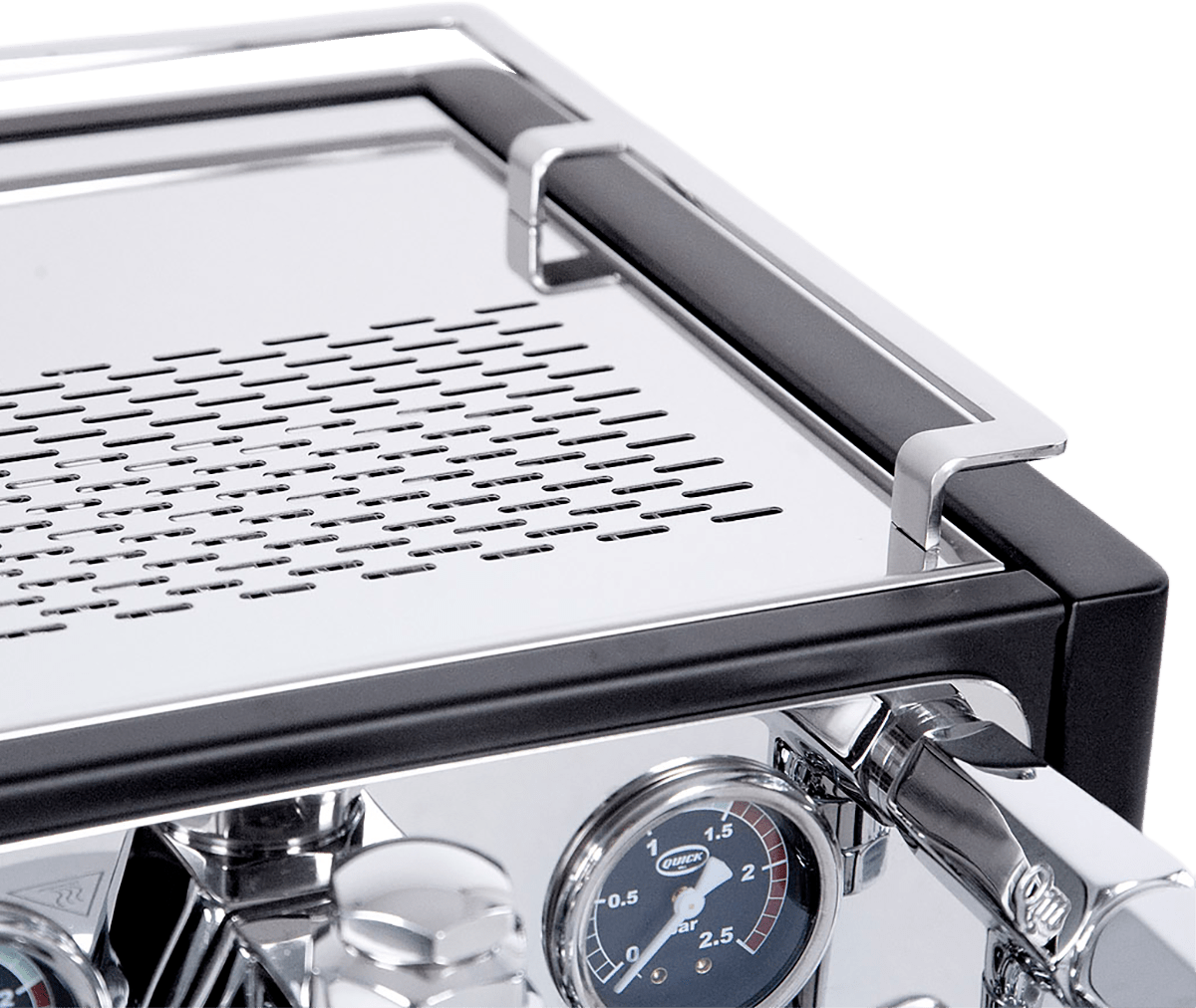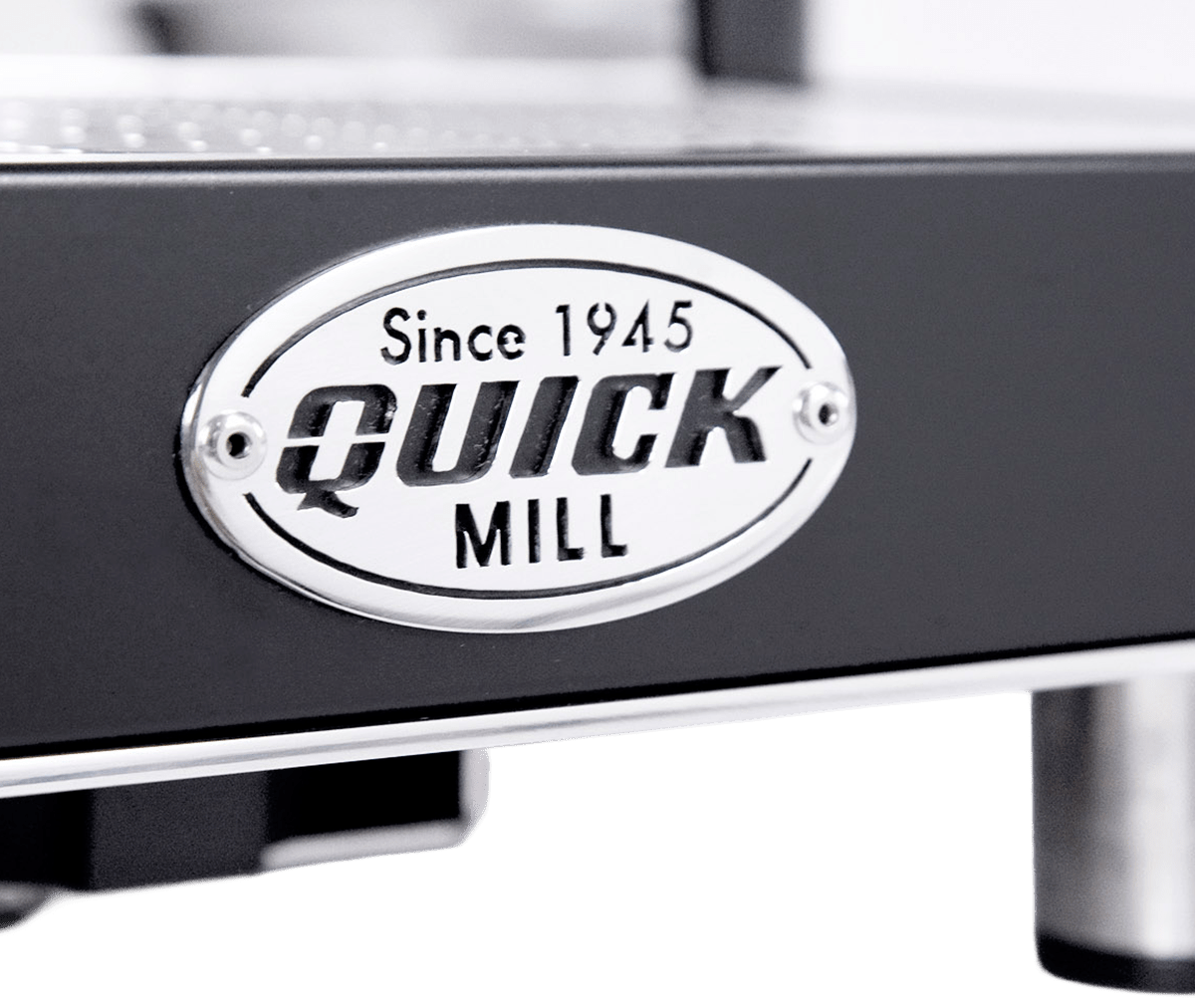 Construction entièrement en acier inoxydable avec des détails noirs profonds, des joysticks et un groupe d'extraction Quick Mill offrant une expression visuelle professionnelle adaptée aussi bien à la cuisine qu'au lieu de travail.