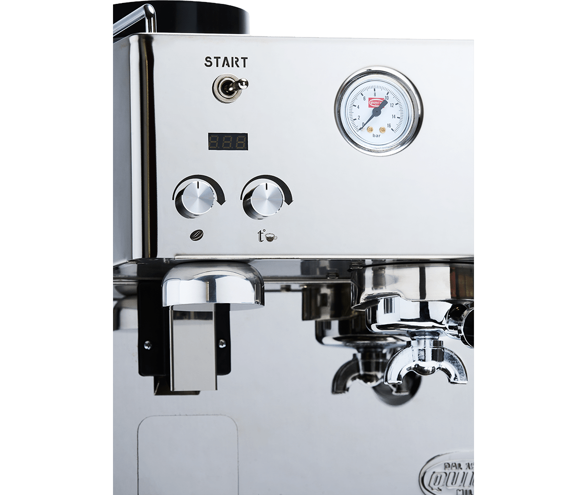 Commandes : PID ; manomètre de pression de pompe 0–16 bar ; affichage (température, minuteur de shot) ; valve de profilage ; veille programmable ; interrupteurs à levier ; voyants indicateurs ; tamper intégré ; bouton de réglage de la température
