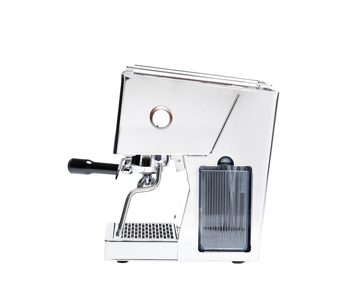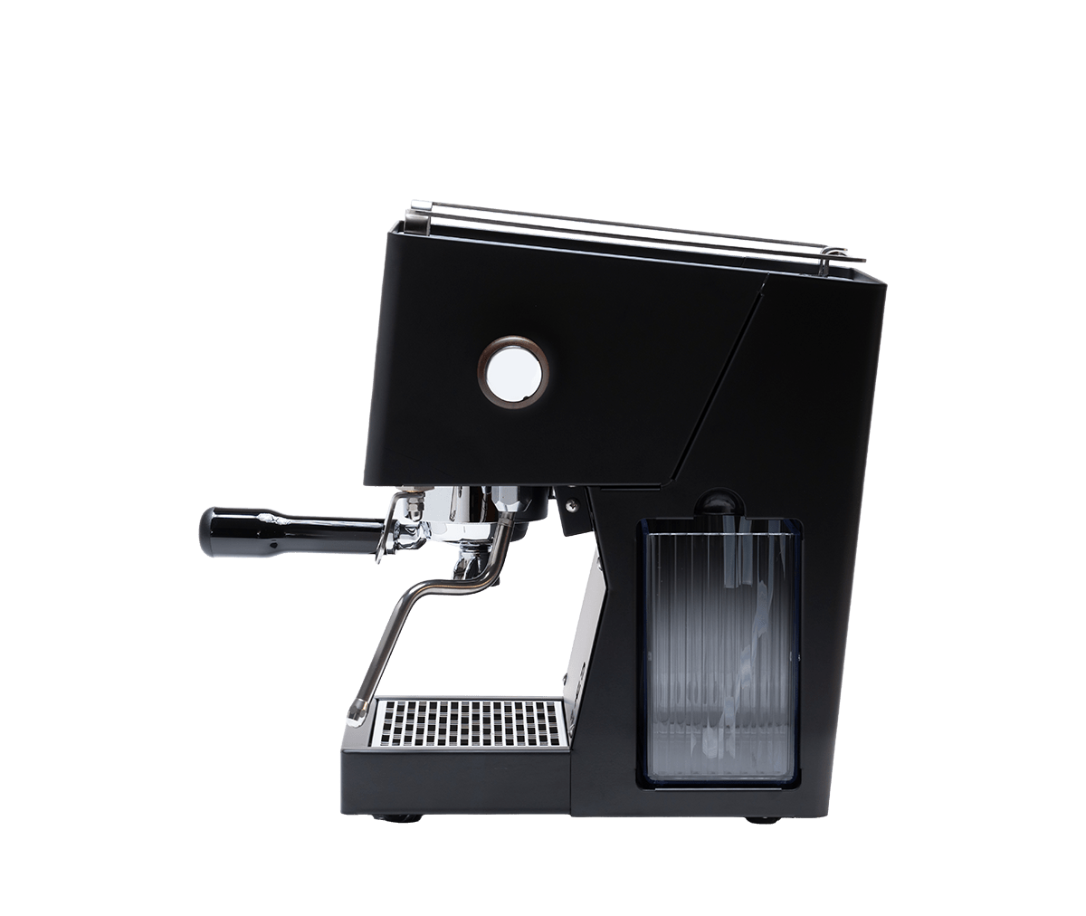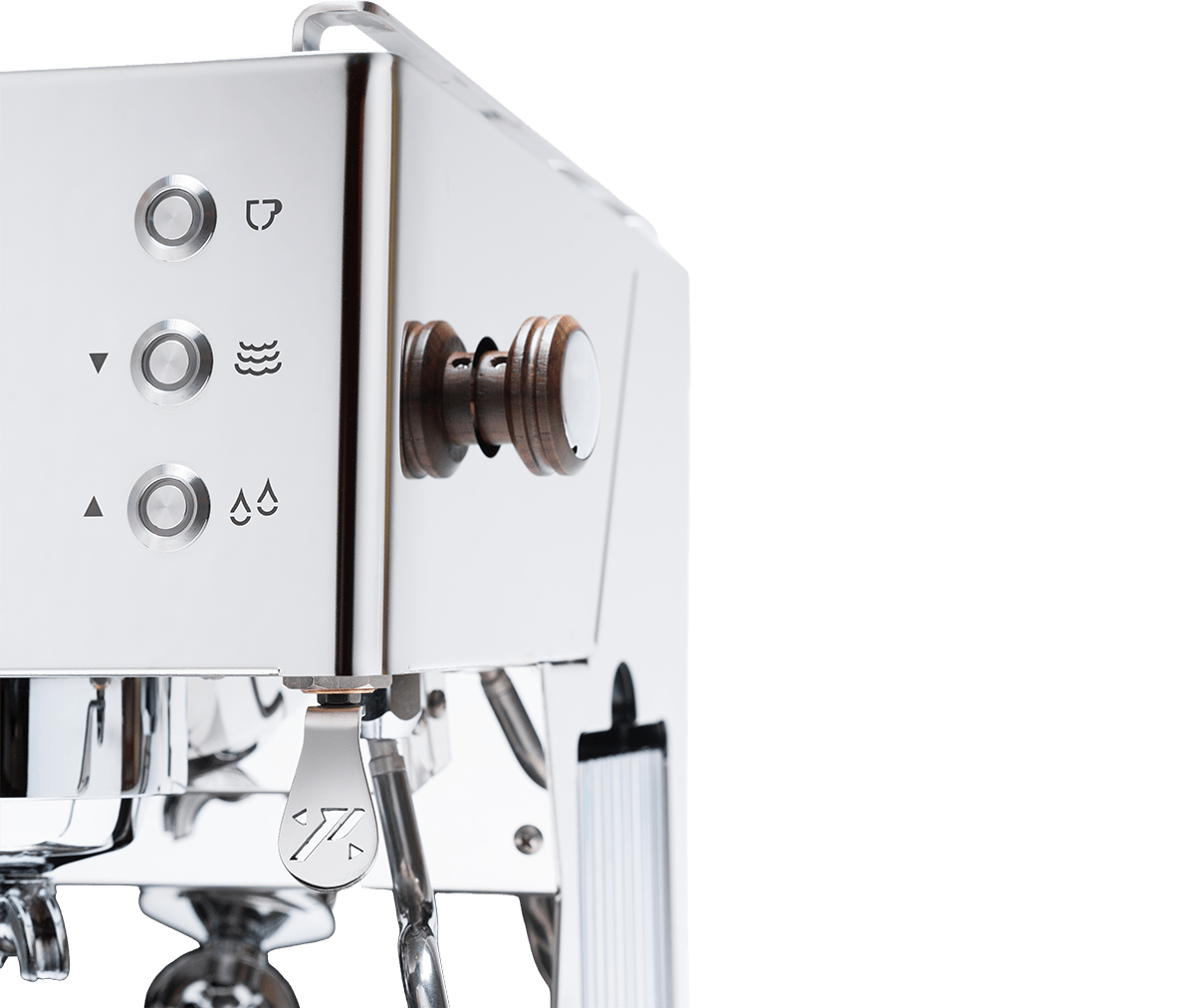 La machine est disponible en acier inoxydable ou noir mat, toutes deux avec des détails en bois sur la manette vapeur et le porte-filtre. Le groupe d'extraction annulaire assure une chaleur constante et une qualité de fabrication fiable.