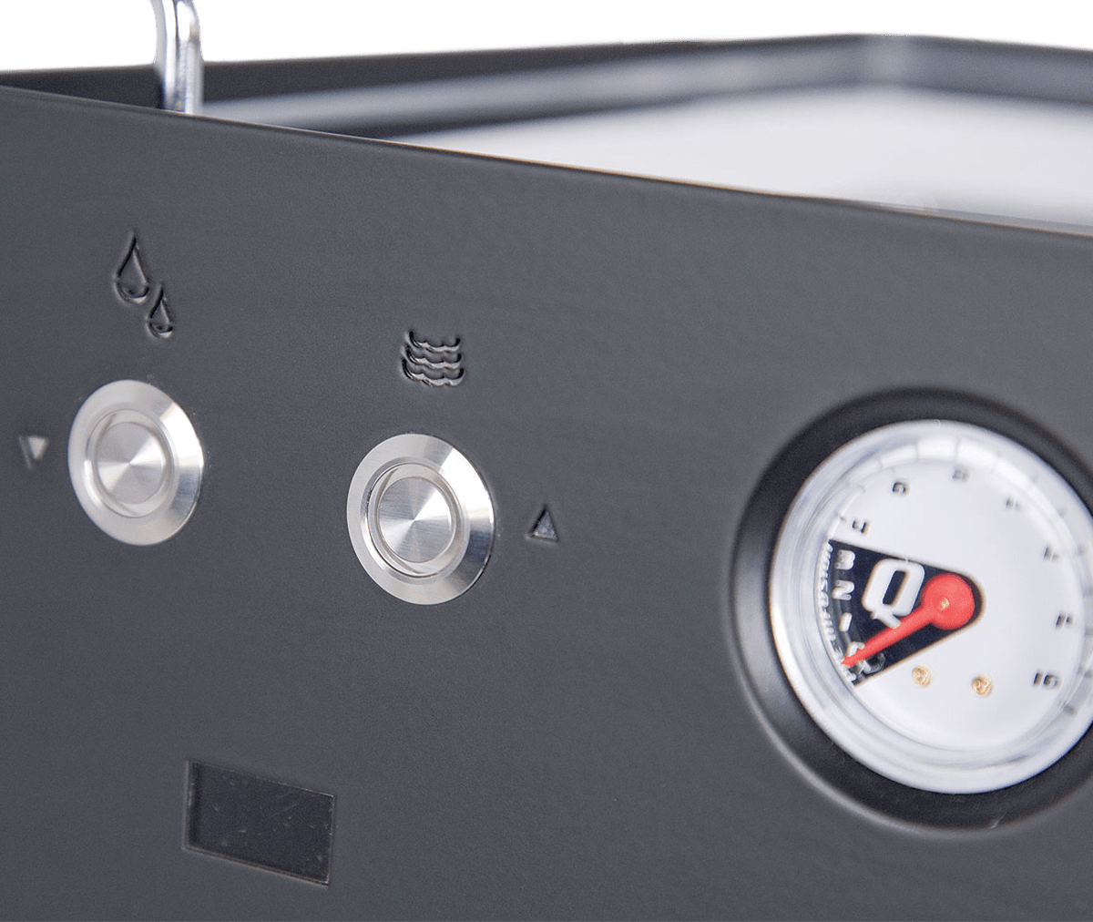 Commandes : PID ; écran OLED ; chronomètre de tirage ; pré-infusion/éco/veille programmable ; manomètre de pression de pompe 0–16 bar ; levier latéral pour profilage ; boutons rétroéclairés antivandalisme ; tamper magnétique ; interrupteur marche/arrêt ; contrôle WiFi